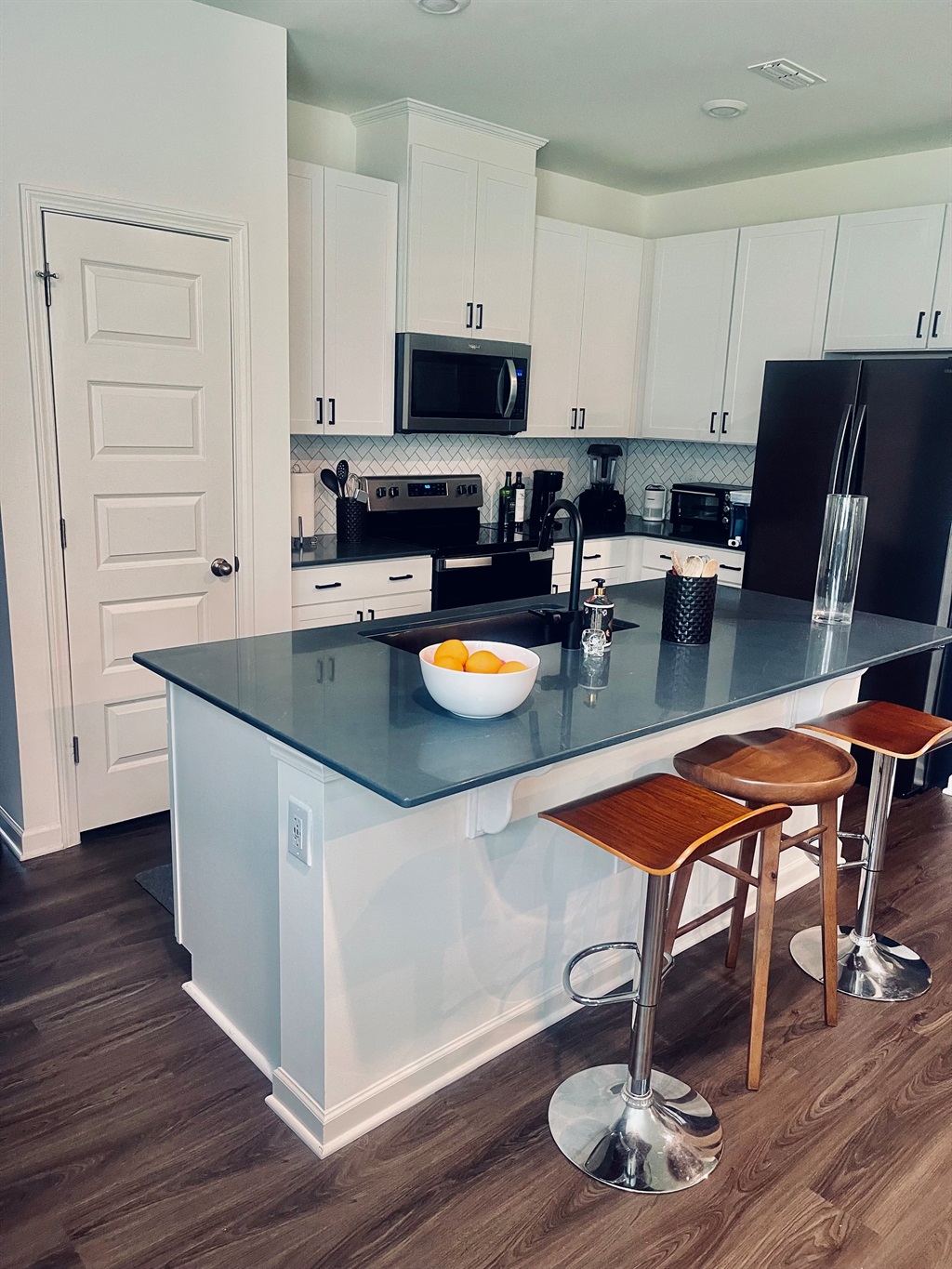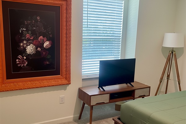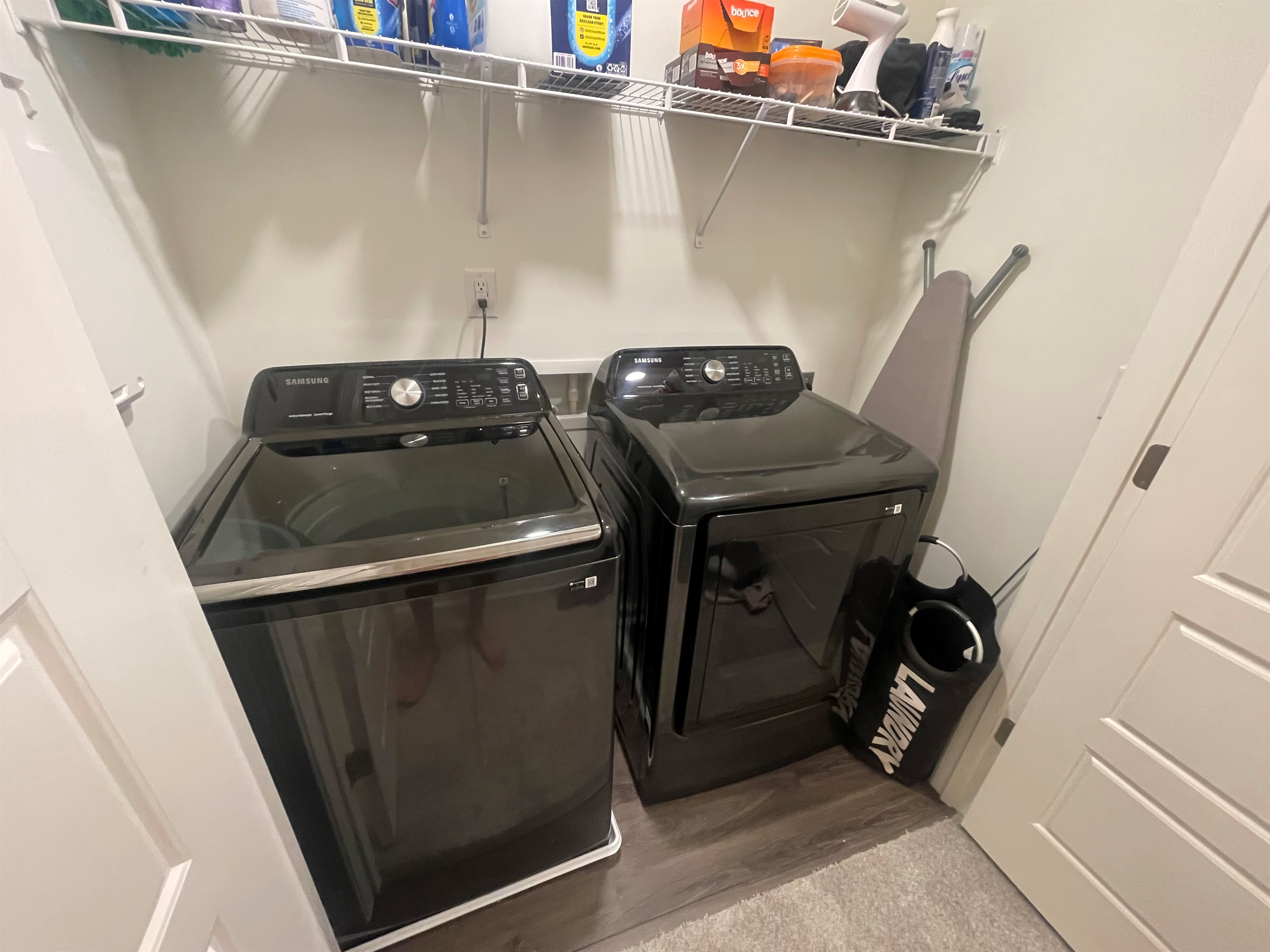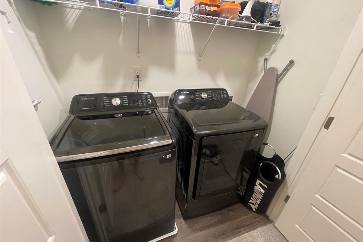 The living space is open and functional, with comfortable seating and room to relax or work from home. The kitchen comes fully stocked for everyday cooking and longer stays, and the home includes an in-unit washer and dryer for added convenience. Parking is easy with a private driveway and assigned spaces.